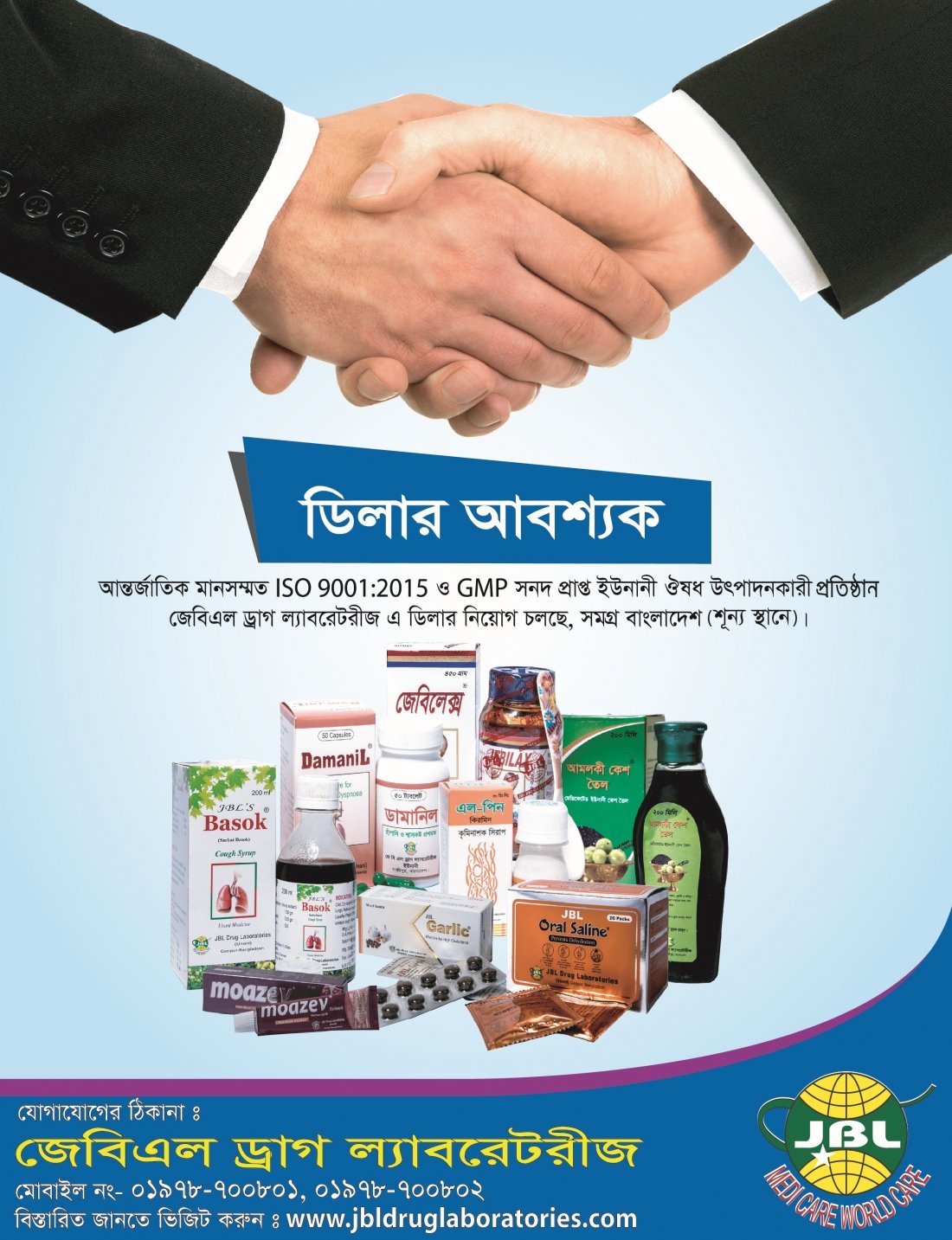 ডিলার আবশ্যক! আন্তর্জাতিক মানসম্মত ISO 9001:2015 ও GMP সনদ প্রাপ্ত ইউনানী ঔষধ উৎপাদনকারী প্রতিষ্ঠান জেবিএল ড্রাগ ল্যাবরেটরীজ এ সমগ্র বাংলাদেশের শূন্য স্থানে ডিলার নিয়োগ চলছে । আমরা ১০ বৎসর যাবত মানব সেবায় নিয়োজিত। আমাদের ৮টি ক্যাটাগরিতে ৫৭টি প্রোডাক্ট(ঔষধ) রয়েছে । প্রোডাক্ট ক্যাটাগরি : ট্যাবলেট, ক্যাপসুল, সিরাপ, সেমিসলিড, অয়েল,অয়েন্টমেন্ট, পাউডার ও স্যালাইন। যোগাযোগের ঠিকানা : জেবিএল ড্রাগ ল্যাবরেটরীজ, প্রমি কমপ্লেক্স, কুনিয়া পাচর, তারগাছ চান্দোরা রোড, গাজীপুর-১৭০৪। Drug License : U-231. হটলাইনঃ ০১৯৫৮৪১০১০৬, ০১৯৫৮৪১০১০৭, ০১৯৫৮৪১০১০০। আমরা আপনাকে শনিবার থেকে বৃহস্পতিবার (৯ঃ০০ থেকে ৮ঃ০০) পর্যন্ত সেবা দিয়ে থাকি। :) ___________________________________________ JBL Drug Laboratories is a Unani leading company committed to producing high quality medicines and new ways to assist people better manage their health. It is a Bangladesh based Medicine Manufacturing Company with over 10 years of experience focusing on value medicine and drugs to provide quality needs. We have achieved GMP and ISO 9001:2015 certification for our quality. Drug License : U-231. Find us on: www.facebook.com/jbldruglaboratories Watch us at: https://youtu.be/hBmKv4qO7tE or Visit: www.jbldruglaboratories.com